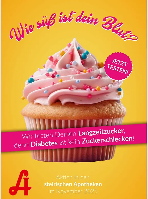 In Zusammenarbeit mit der Apothekerkammer Steiermark findet im November, unter dem Motto "Wie süß ist dein Blut?", eine Aktion zur Bestimmung Ihres individuellen HbA1c - Langzeitzuckerwertes in unserer Apotheke statt. Der HbA1c - Wert spiegelt den Blutzuckerspiegel der letzten sechs bis zwölf Wochen wider und kann Aufschluss darüber geben ob man Gefahr läuft an Diabetes Typ 2 zu erkranken.